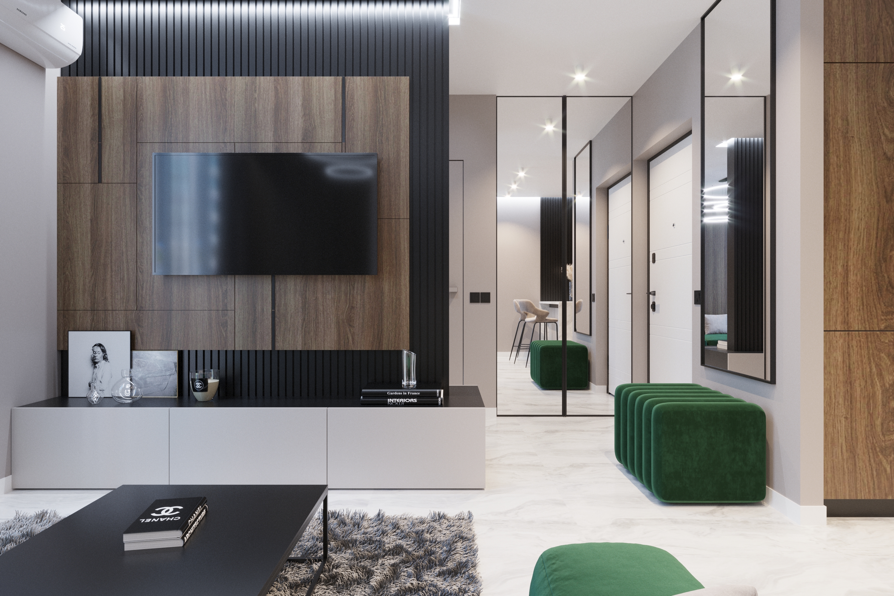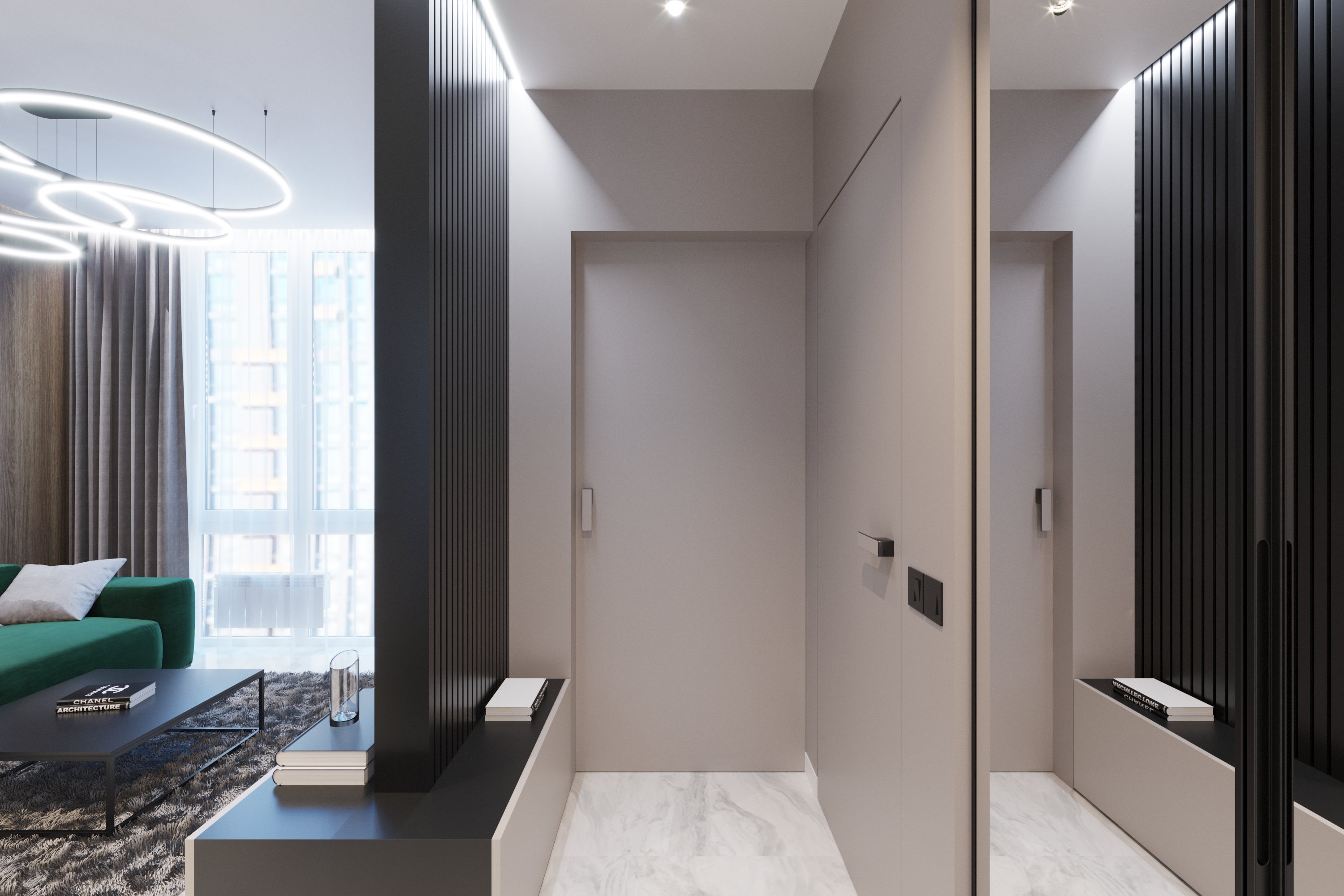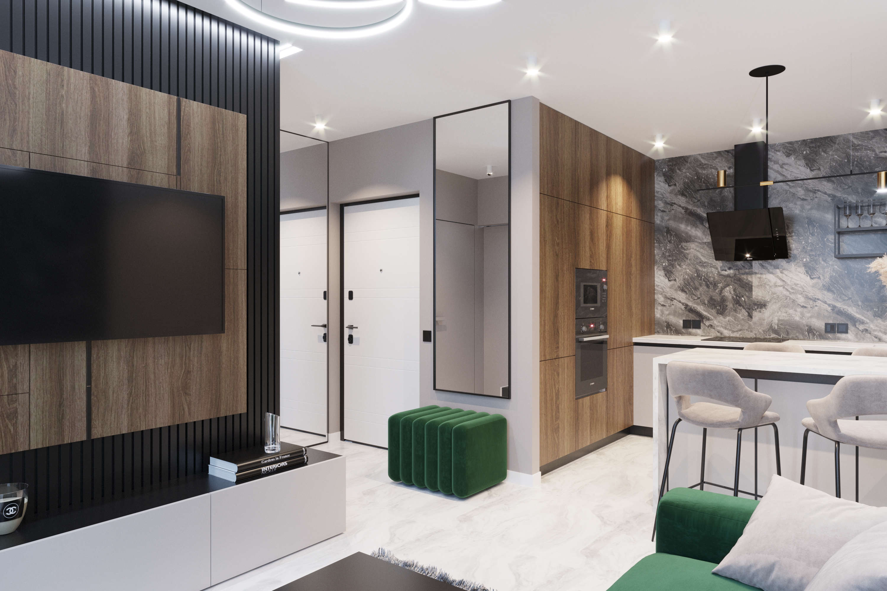 Современный дизайн-проект однокомнатной квартиры 42 м2 в ЖК Seven. Функциональная планировка, стильный минимализм и продуманная эргономика для комфортной городской жизни.