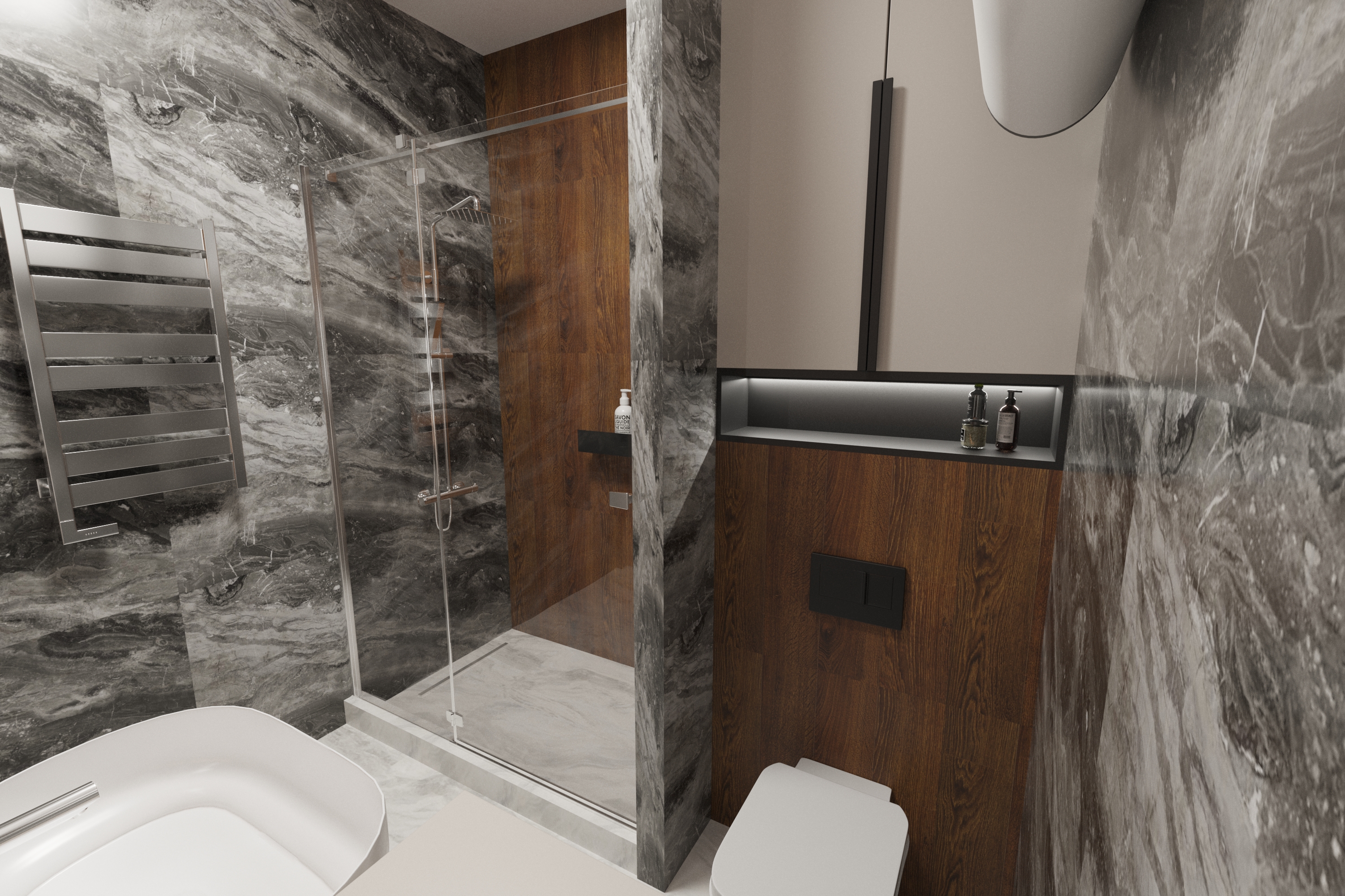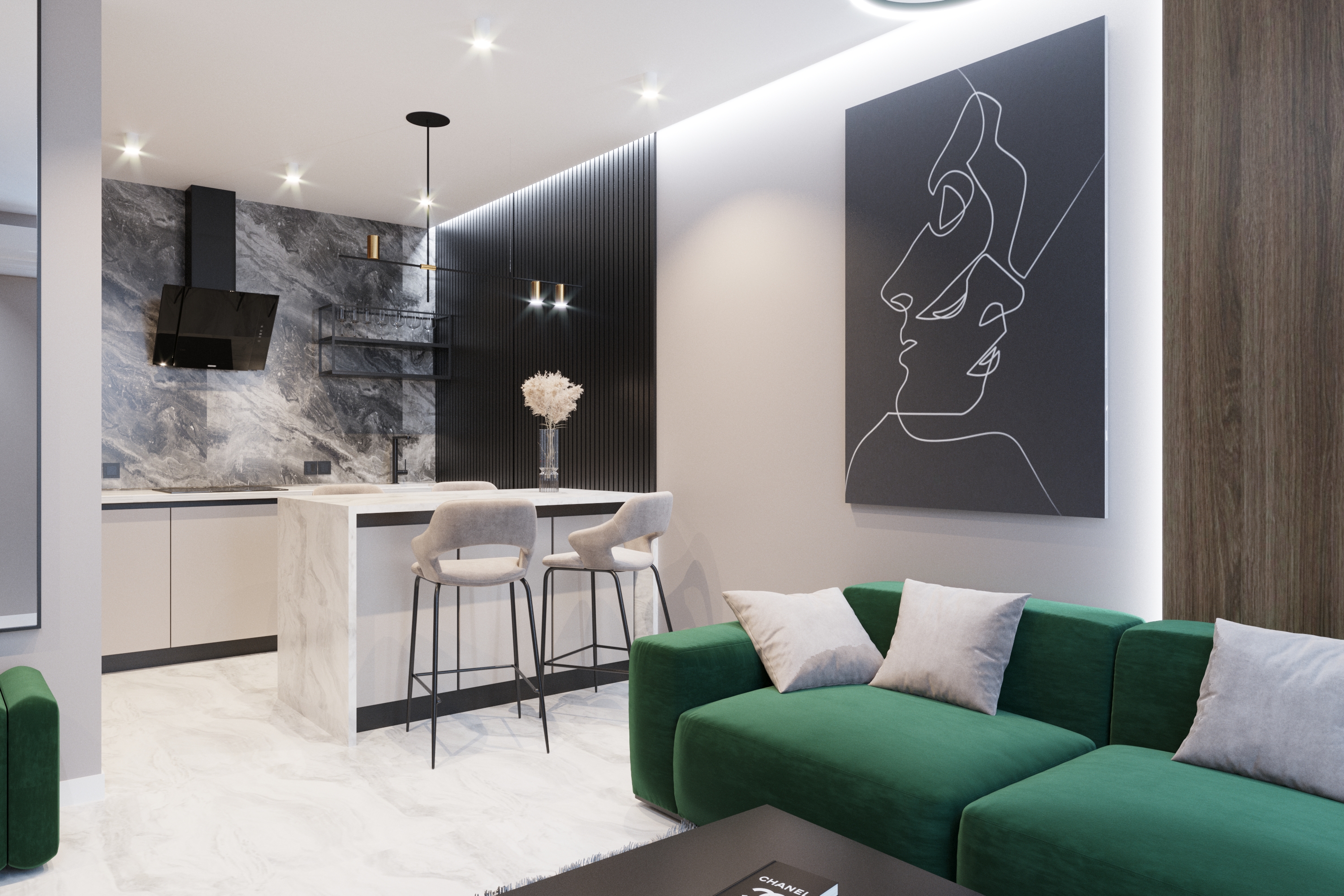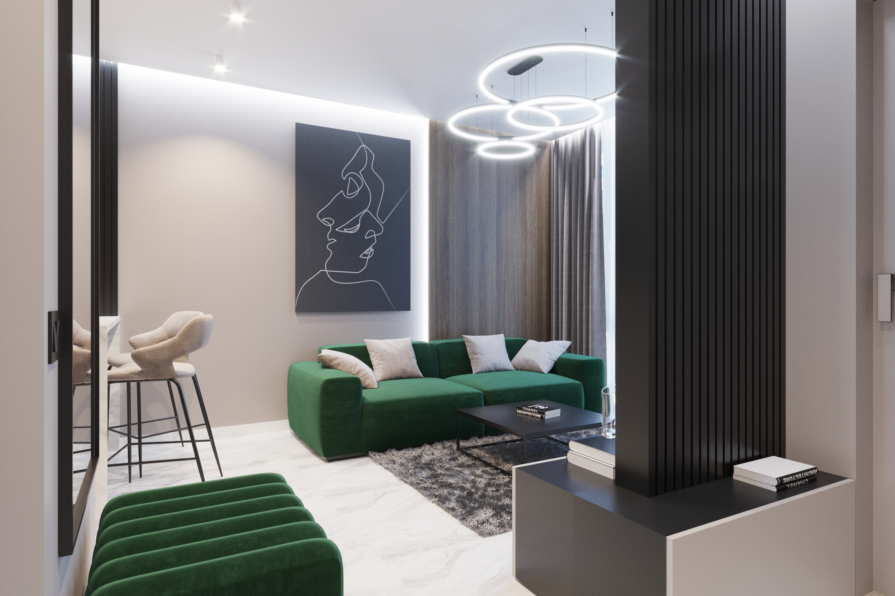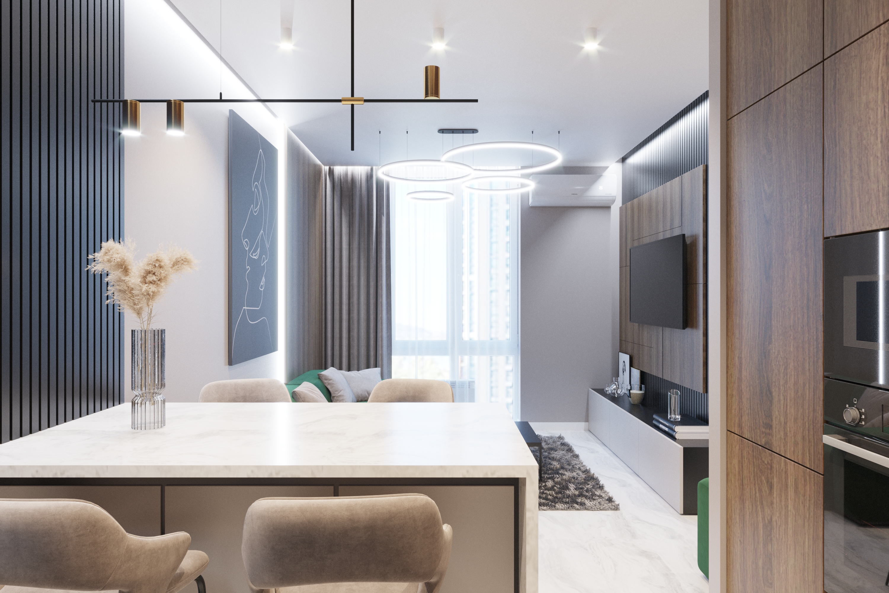 Современный дизайн-проект однокомнатной квартиры 42 м2 в ЖК Seven. Функциональная планировка, стильный минимализм и продуманная эргономика для комфортной городской жизни.
